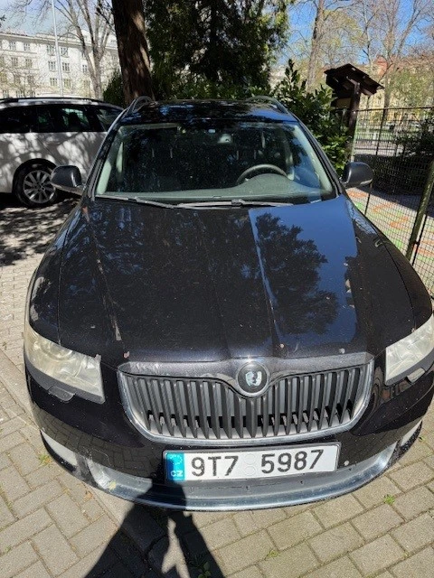 ŠKODA SUPERB 3T, r. výroby: 2010, barva: černá-metal, RZ: 9T7 5987, VIN TMBJE73T1A9040007 - počet najetých kilometrů 423 484 Km, poškozené čelní sklo od kamínků, svítí kontrolka žhavení, kontrolka světel, kontrolka diagnostiky motoru, palubní počítač zobrazuje hlášku: porucha motoru, závada airbagu, servis nyní, na vozidle se vyskytuje povrchová koroze laku; k vozidlu je technický průkaz (malý, velký), klíč od vozidla 2 ks, a 2 ks klíčů k mechanickému zařízení.